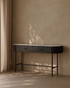 The Lantine Console Table combines sophisticated design with practical functionality, featuring a matte white natural Carrara Italian marble top paired with drawers and body in Black Oak. Its matte black ribbed end panels and sleek black legs create a bold, contemporary silhouette, while matching black handles complete the refined look.